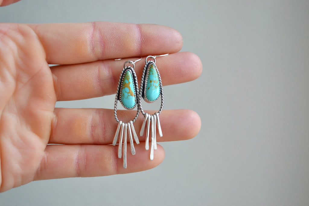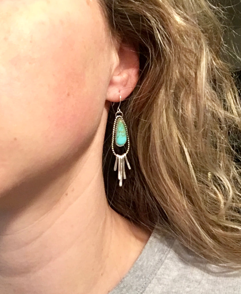 Kingman Turquoise wrapped in a twist wire with sterling silver fringe goodness... because we needed that kind of fun movement on our ears. Am I right?! These are definitely one of my most favorite pairs I've made, and truly would would look incredible on anyone!