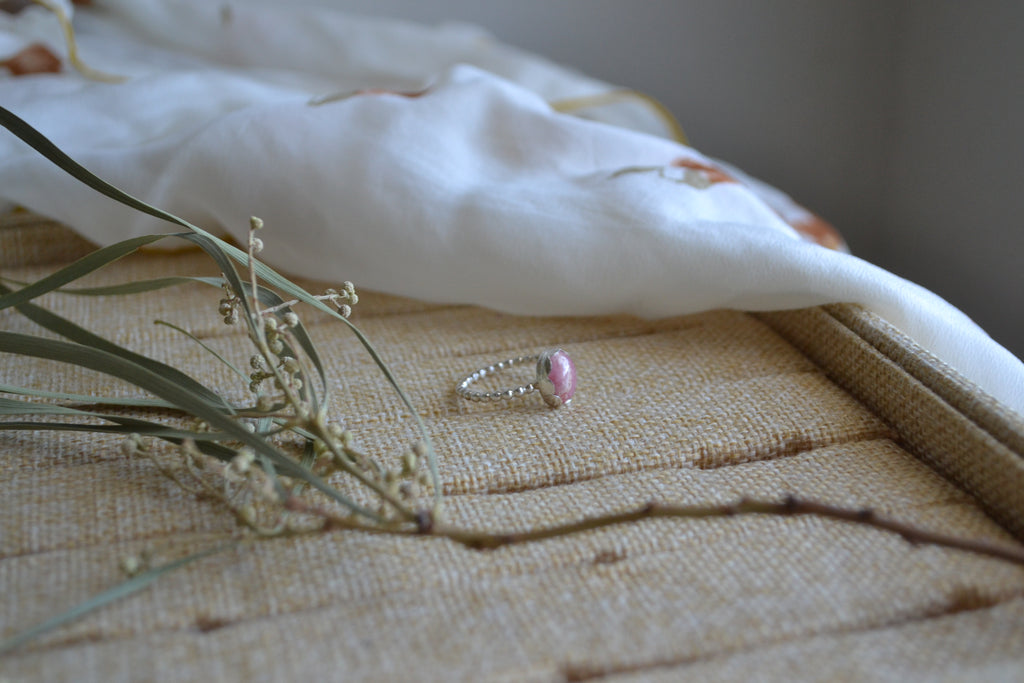The perfect dainty rhodochrosite pink stone ring. I just love her. The bead wire band is just the right pairing, and the scallop bezel kind of makes it look like a flower bud. Rhodochrosite stones are known to promote love, passion and tranquility. Get your love on!