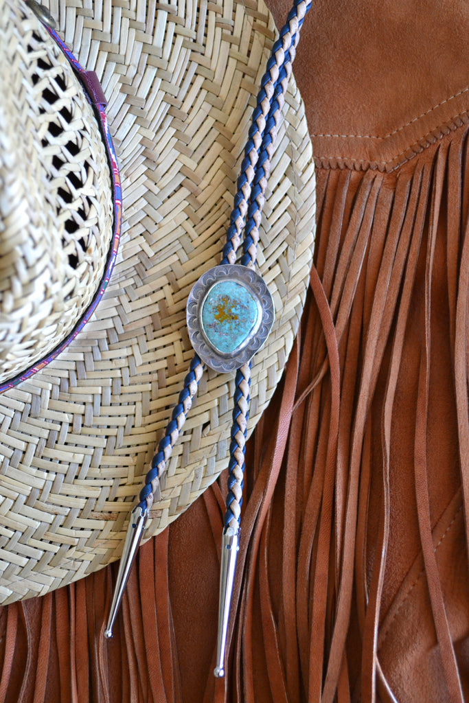 Everyone needs a timeless western inspired turquoise bolo! This bolo is made from 925 sterling silver and a turquoise stone on a durable black and tan braided cork cord (a perfect vegan option, if leather isn't your thing). It has a tension backer to easily adjust where you want the stone to lay.