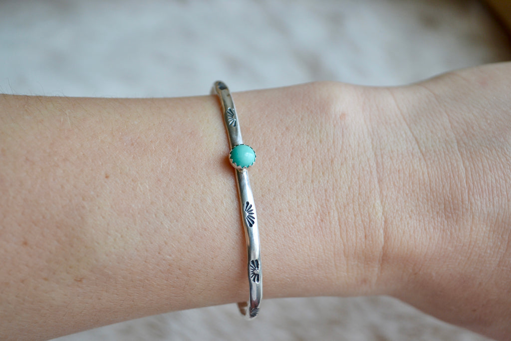 Look up the definition of cute... and you'd see this little guy. The sunrise stamping design makes me feel hopeful, and I love that it promotes that feeling. The turquoise stone is 6mm on a 8 gauge sterling silver half round wire.